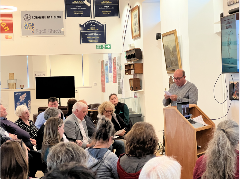 📷 Angus Murray singing at a public talk, Comunn Eachdraidh Nis, Ness, Lewis. June 2025. (Photo by Mary Stratman)